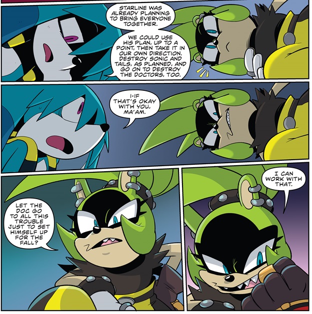 Starline is somehow convinced by this, probably because he assumes that they have finally realized his genius, and lets them know more about the upcoming plan. The idea is to infiltrate Eggman’s latest facility and upload a virus into it that will allow them to take over, much like he did with the Eggnet Facility in the Bad Guys mini-series, which will attract the attention of the Restoration. For Starline, this means finally defeating Sonic and crew in front of his idol Eggman, and for Surge and Kitsunami it means a chance to kill everyone and walk away as the only survivors. Pretty lofty goals if you ask me, but I admire their gumption!