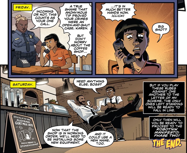 Continuing more or less right after the events of the first story, this next one titled The Secret of My Distress follows Agent Stone as he… well it’s a bit hard to describe without both over-selling it and understating it. We know from the trailers that Stone ended up as a barista at some sort of coffee shop, but what we don’t know is how he ended up there in the first place! Sounds riveting, right? Well, what if I told you that the story involved a terrifyingly detailed manifesto from Robotnik, a kidnapping of a person, and false felony charges that may end up sending an innocent woman to jail for several years? I’ve either piqued your interest or lost you completely, so let’s try and piece this together. Agent Stone has a copy of instructions from Robotnik that we have narrated to us throughout the story about how people are sheep and the world belongs to those who take charge. Stone uses this advice as well as the Robotnik Tech he took in the last story to get a job at a coffee shop and then systematically remove everyone there through increasing convoluted and terrifying means. To what end? I couldn’t tell you. You’d think someone with this kind of bloodthirsty attitude and access to unimaginable tech would aim a bit higher, but lattes were a thing in the movie so I guess they’re a thing here as well.