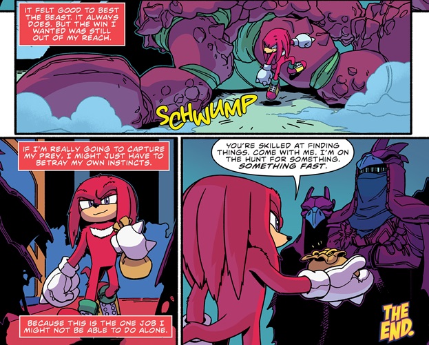 The next two stories, Always Bet on Red and Two for the Road, are much more in line with what you’d expect from a Sonic comic and are hopefully what we can expect to see more of in the upcoming movie. The first follows Knuckles through an interdimensional hunt for Sonic the Hedgehog, and while he remains cagey on the details, it’s clear that his task is a very serious one. We learn that he’s the last of the Echidnas which is a little odd considering we saw a whole bunch of them at the start of the first movie, but maybe something happened after Sonic left that he could have prevented or something like that. In any case, Knuckles is definitely written as you’d expect him to be, as hard-headed as he is hard-hitting, but he gets kidnapped mid-dimension hoping to fight in some sort of arena; indicating some great powers at play on other worlds that could ALSO be a part of the new movie! Oh, who am I kidding? We’re gonna spend ninety-five percent of our time on Earth to save on the budget just like in the first one! Still, whether he’s on a fantastical planet of monsters or just on boring ol’ Earth, Knuckles is sure to liven things up significantly!