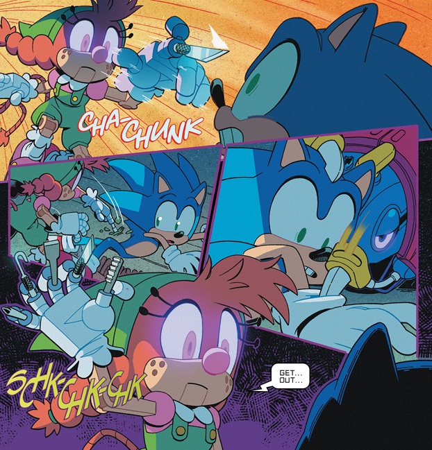 Sonic artwork has been hit-or-miss at times, especially when it comes to the action, and this issue has a few more misses than usual. I don’t know what’s up with Sonic’s weird hands here or the fact that his arm is connected to his neck and not his shoulder, but it doesn’t set a great tone for the rest of the issue that feels like several parts of this could have used another pass. I don’t know if I’ve ever noticed this in a comic before, but the onomatopoeias didn’t read well to me with stuff like KLIK-DING over a smashed bookcase and CHA-CHUNK for a very tiny mechanism opening to reveal a sharp blade. I guess I’m getting a bit ahead of myself here so I should probably provide some context for these. The test seems to go well with the Badniks refusing to attack Sonic, but later that night there seems to be a counter signal that turns them back to baddies and even manages to overtake Belle. Sonic and Tails try to stop her and the friendly Moto Bug (delightfully renamed as Moto Bud), but without much room to run around Sonic is rather easily overwhelmed.