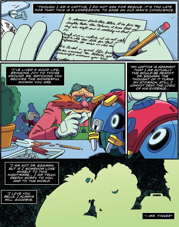 Thankfully Tails manages to run in with a zappy-thingy (it’s that science do-dad that he used to neutralize the Zetis’ power) and manages to cut off the signal that was making Belle act all stabby. She reveals that it was a global call to all Badniks to head to one of Eggman’s numerous lairs for something big and no doubt destructive. It feels a bit rushed to have Belle back to normal so soon, especially given the cover that puts her mind-controlled state front and center, and I can’t help but wonder if the one-shot we gave to the Chaotix last time could have been better used to build up this conflict. In any case, they follow the still mind-controlled Moto Bud to the secret location, but Belle makes the decision to cut his power instead of letting him go die in some robo-war. Whether they can bring it back is a question for another issue, but the decision leaves Belle distraught and she collapses on the robo-corpse only to find something stuck in its casing. It turns out that this wasn’t just some random Moto Bug with a glitch; he was sent to find Belle and deliver a message to her. Who would have done such a thing? Why none other than her father Mr. Tinker; the good alter ego of Eggman after he got amnesia all the way back at the very start of the series.