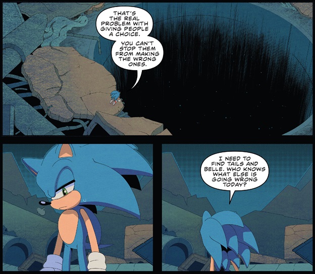 The two go back and forth with the endless ferocity of two speedsters with chips on their shoulders, but Surge’s inexperience eventually costs her the match as she nearly falls down a giant hole. Sonic tries to pull her back up as is the custom of The Good Guy, only to be zapped by her electricity in a last-minute burst of spite and falls to her presumed death. At the very end of the fight, there’s a line from Sonic that shows at least something of a dark side within him which I found somewhat interesting. His philosophy of giving everyone chance after chance to turn to the good side is something that even he can acknowledge breaks down when there’s a clear goal that he’s striving for. He wants the world to be a better place, but it can’t be that way as long as he gives those who want the world to be worse just as much room to do what they want as everyone else. Perhaps this is meant to be a parallel to Eggman who has come to the same understanding and decided to embrace the cruelty of a perfectly run world, but then I’m probably thinking too hard about a book that is nominally aimed at pre-teens. Still, it was an interesting moment if nothing else and I’m hopeful that Surge’s eventual return will give the writers another chance to address the issue.