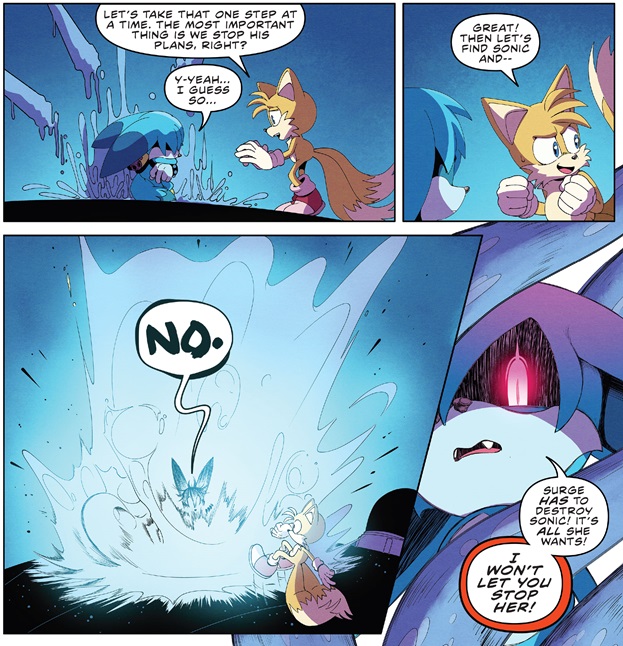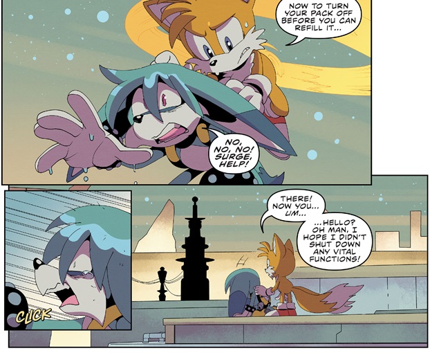 Tails tries to talk down Kitsunami but he’s intent on stopping Sonic for the sake of Surge. It doesn’t take long though for him to run out of water which Tails quickly takes advantage of and that’s all she wrote. The most dangerous member of the group goes down like a punk because he didn’t refill his water jug. Pretty disappointing if you ask me given the buildup, but I guess they can kick his more sinister sendoff for a later issue given that he’s the only one that seems to have survived this ordeal.