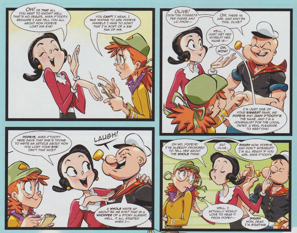 Our story begins with a plucky reporter named Judy P’Tooty who is determined to find out just how the legendary sailor Popeye lost his eye. I guess this proves what a fair-weather fan of Popeye I am, as I always thought he was just squinting, but apparently he’s missing an eye and everyone and their mother is ready to tell Judy how it happened. As a framing device for a first issue, this works well enough as we hear fantastical stories from Olive Oyl, Bluto, and Wimpy that perhaps are light on truth but reveal pertinent details about the cast. No one is going outside their established characters as Olive carries a torch for Popeye, Bluto is a mean-spirited blowhard, and Wimpy is fastidious about his hamburgers, but given how unlikely it is for young readers to know the finer details of these characters, it’s important to get everyone up to speed.