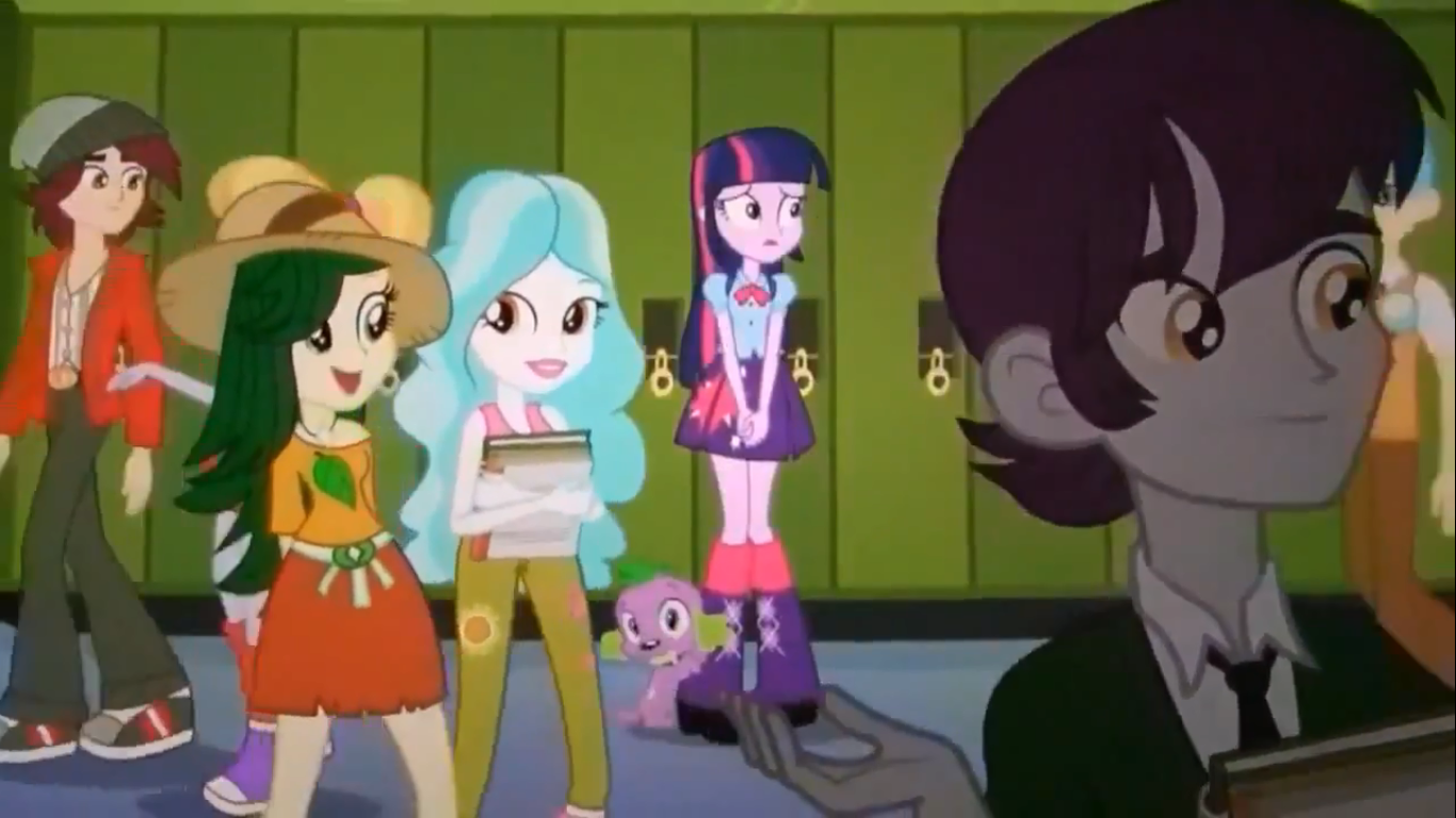 We also see that Twilight is worried about the responsibilities (still unspecified) of becoming a princess. Her having these doubts and worries helps take some of the bad taste the season three finale left me with. The episode ended up feeling like the kind of shallow wish fulfillment that entertainment aimed at girls has been pandering for decades, and the kind of stuff that Friendship Is Magic was actively avoiding. Now we can see that being princess isn’t what Twilight wanted to an extent and that despite being honored that Celestia puts so much faith in her, she still has doubts about her abilities to lead. While I understand ending the season on a high note, this aspect should have been at least introduced in the finale, if for nothing else than to show the fans that the series and staff weren’t sacrificing their integrity so they could sell out to Hasbro (or whatever conspiracy theories were floating around during that time). We also get introduced to Flash Infantry (Twilight’s love interest seen in the trailer), but he doesn’t do anything other than set himself up as a character who exists in this world as well as the human world. Other than that, we get a little back story on Sunset Shimmer and a somewhat flimsy excuse for why the others can’t follow Twilight into the portal (UPSETTING THE BALANCE!!!!). So we hop skip and jump into the human world where Twilight is a human and Spike is a dog. Not an actual complaint but I question how the dimensional portal decides what species gets turned into what when it goes from one world to another.