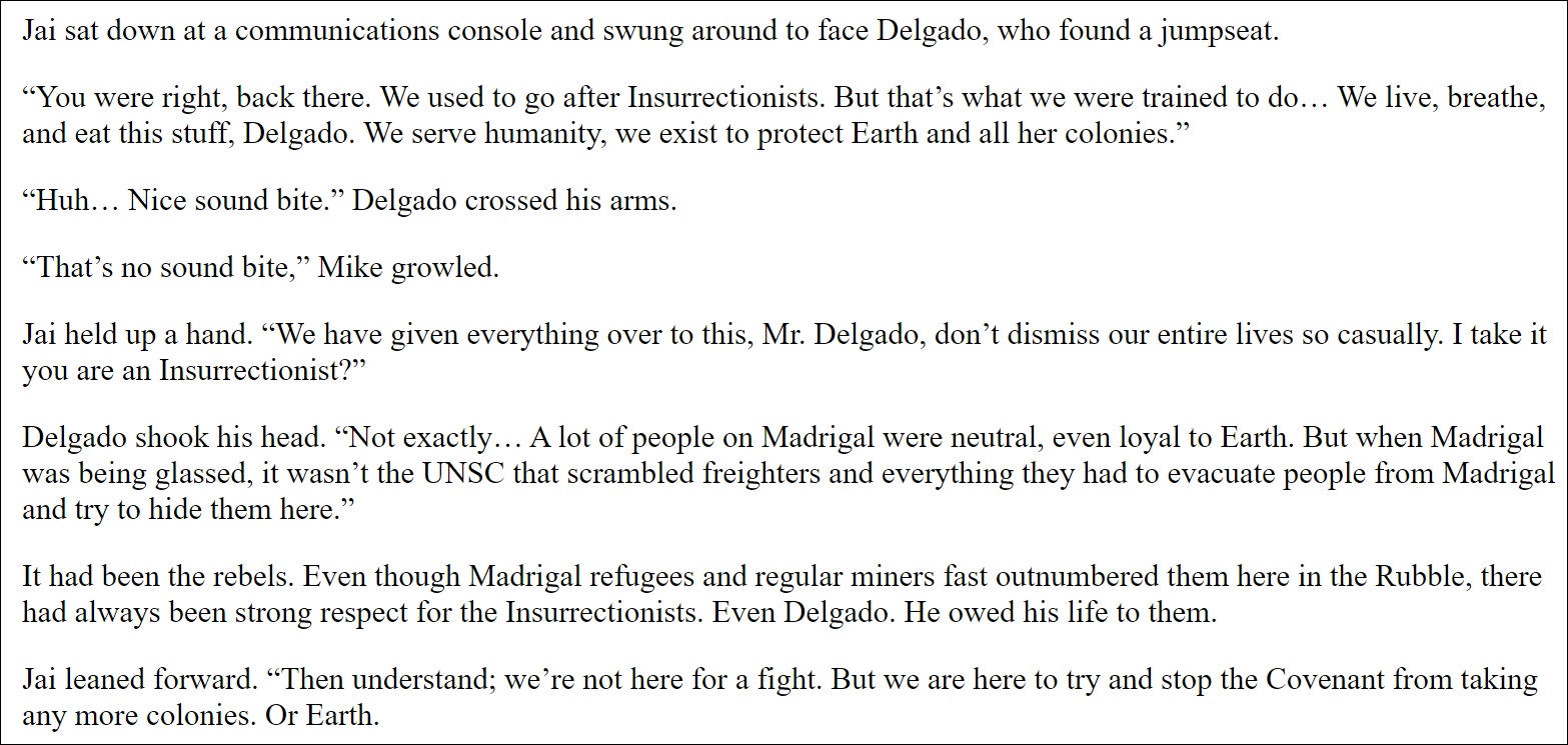 So it seems that Contact Harvest being a prequel wasn’t a one off for the book series and that we’ll be spending more time AROUND the Halo games than telling stories between.  Continuity wise it’s SOMEWHERE in that nebulous space between Contact Harvest and The Fall of Reach, though leans much close to the latter since the Spartans are around and doing their thing for the war effort.  This time though things are a lot less IN YOUR FACE BOMBAST as the story feels much closer to a spy thriller with various factions trying to out maneuver everyone else over a colony that shouldn’t even be there.  Frankly it’d be more accurate to call this The Rubble instead of The Cole Protocol, but I guess protocol sounds cooler so they went with that.  In any case, the story takes place in the secret separatist colony known as The Rubble; one big town hidden amongst a whole bunch of asteroids that are held in place by an AI named Juliana who is VERY invested in keeping this hunk of junk livable.   Some of them are Insurrectionists, some are there for the great trading opportunities, and all of them want nothing to do with the UNSC; so much so that they’ve more or less made a peace agreement with the Kig-Yar; the Jackals of The Covenant who are MUCH more interested in finding and trading loot than spreading the world of The Forerunners and blowing up heretics.  Sadly, this state of affairs cannot last forever as there appear to groups within The Rubble trying desperately to get their hands on a data chip that has detailed navigational data to Earth which could spell doom for humanity if The Covenant got their hands on it.  To make matters worse, both a UNSC ship (eventually commanded by a younger Captain Keyes) as well as an Elite ship manage to come across this unauthorized “peace” which only escalates tensions and forces the hands of those who have sinister plans for all involved.  Who is trying to get this data, and what do they plan to do with it?  Are the Kig-Yar sincere in their desire to keep this colony out of the greater war, and what consequences could befall them for taking such a stance?  And on top of all this there’s a small group of Spartans watching all of this and pushing events towards some sort of end goal that may ultimately be in Earth’s best interest, but is The Rubble and the people who built it just collateral damage?  I’m not about to say that the book is evenhanded with its politics as military wisdom and strong leaders tend to fare better than those who follow more democratic ideas, but the fact that we’re bouncing around various stories with characters driven by believable motivation makes this one more genuinely engaging novels in the series so far.