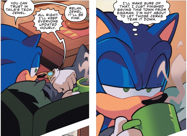 The issue begins with everyone in place for the upcoming Zeti attack as The Chaotix are in Sunset City, Tails is in Central City, and Sonic is in Winterberg; all of which are names you PROBABLY shouldn’t give to a city.  Sunset City sounds like where Michael Bay films his movies, Central City will always be a relative concept, and what the heck do you do with a town called Winterberg in the summer months?  Does it change its name to Heatville!?  Now the last issue was a lot of exposition to simply explain why characters are in certain locations without any really interesting dialogue or clear character motivations.  Right off the bat things are much better here as Tails is working on a plan to stop the Zeti when found and Sonic is in a somewhat dark mood despite doing his best to chillax before whatever big fight is upon them.  It helps with investing us in the struggle itself because of how it affects the characters who are stuck in the middle of it, and since we know things are gonna go wrong as this is all a ruse set up by the Zeti there will no doubt be some high emotional stakes once things hit the fan.