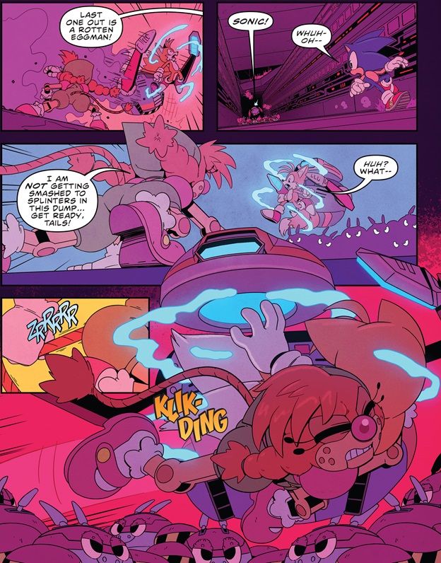 The issue begins with Sonic, Tails, and the living puppet Belle facing their greatest and oldest enemy to date; confusing action scenes that don’t adequately convey spatial relations!  Yeah, I know I’m a broken record on this, but these early pages are another example of the artist just not doing a great job conveying necessary details or relative threats.  The first thing we see low angle shot of them in a rather narrow but tall room (looking a bit like a silo) that is filling from bottom to top with badnicks.  Clearly they would have to find a way out by going UP, right?  No, it’s actually just a PYRAMID of badnicks and they decide to swarm on the side of the room that DOESN’T have the very obvious exit door.  Then as soon as they escape that room and are in the corroder, what I THINK happens is that a grabby badnick drops out of the ceiling to snatch Tails and Bell doing SOMETHING with her tail to save him.